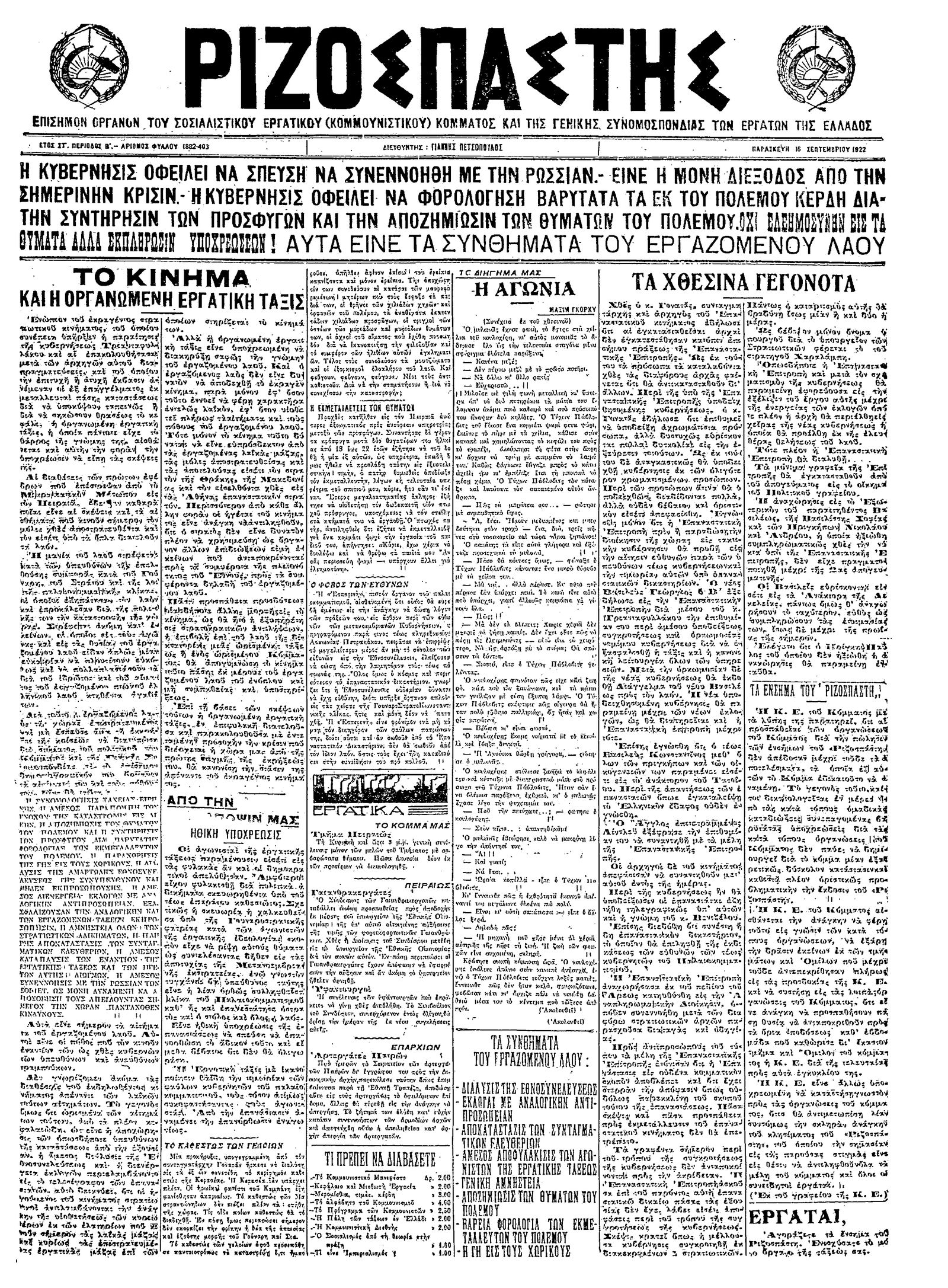 Ριζοσπάστης 16/09/1922