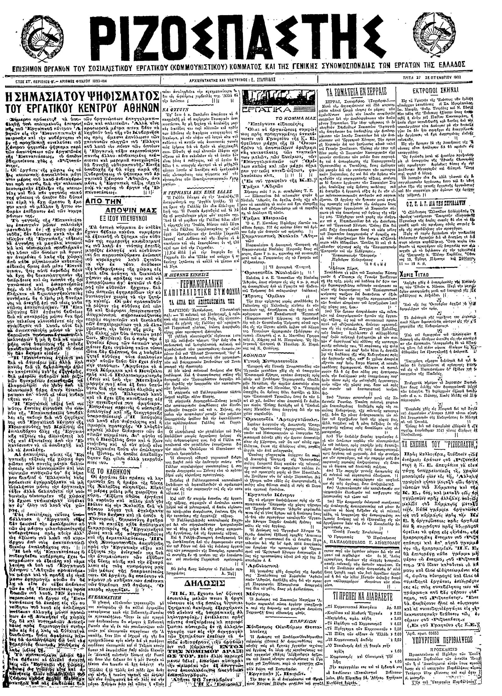 Ριζοσπάστης 27/09/1922