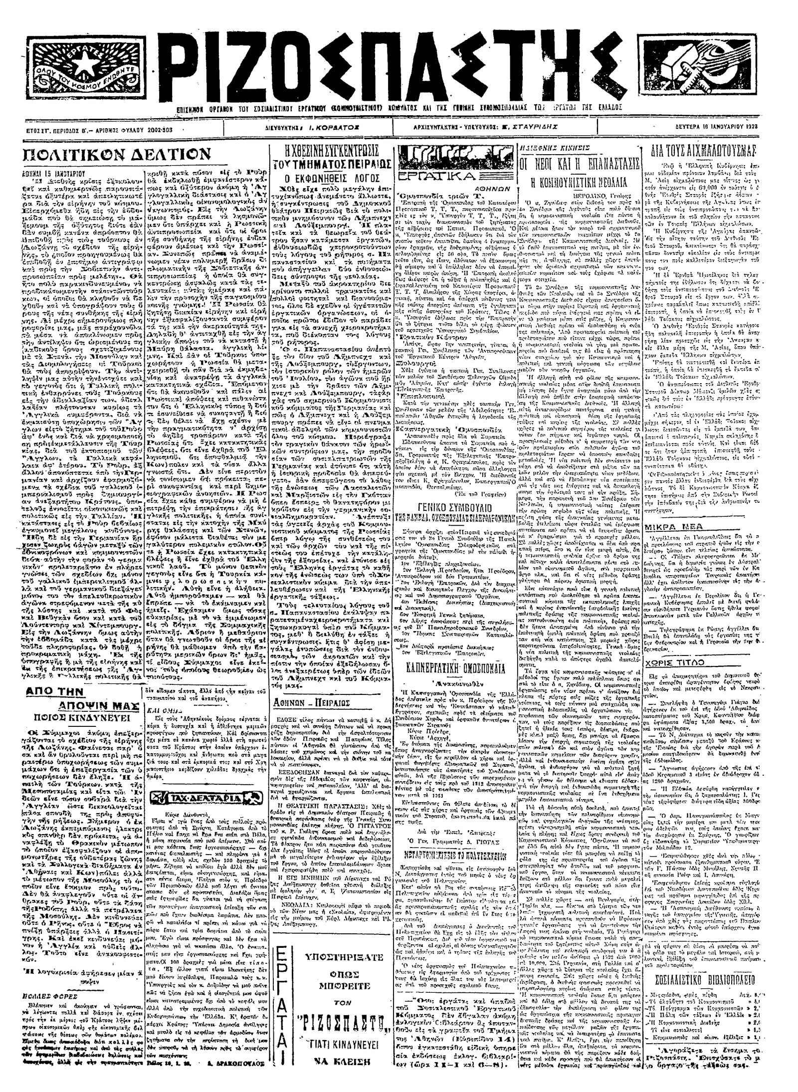Ριζοσπάστης 16/01/1923