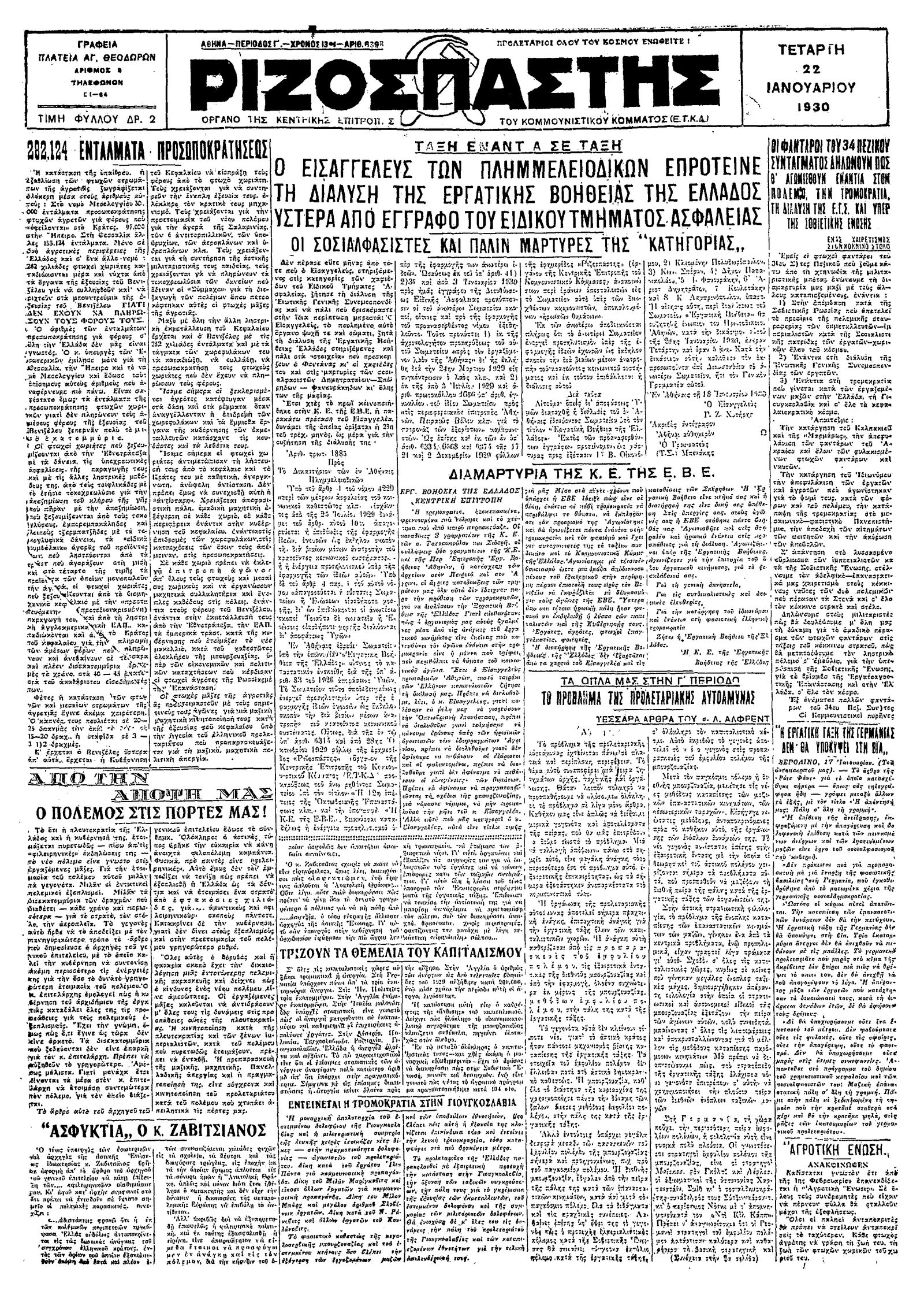 Ριζοσπάστης 22/01/1930