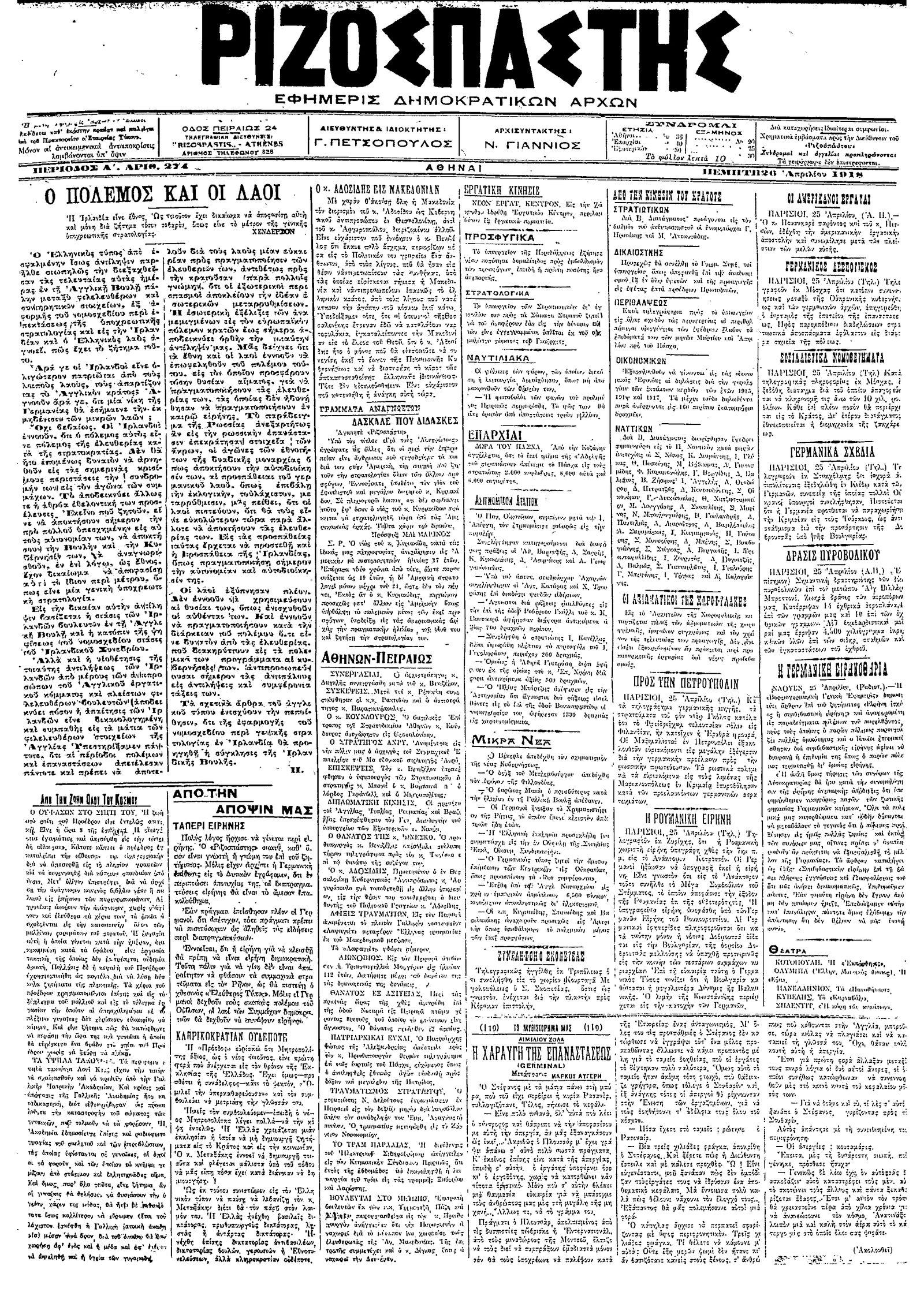 Ριζοσπάστης 26/04/1918